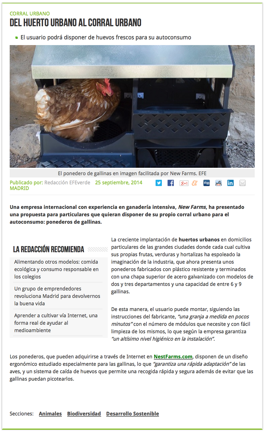 La Agencia EFE publicó un reportaje bajo el título “Del huerto urbano al corral urbano” donde relacionan la reciente moda de los huertos urbanos con los corrales de gallinas urbanos. También explican brevemente las cualidades del producto e informan dónde se pueden adquirir.